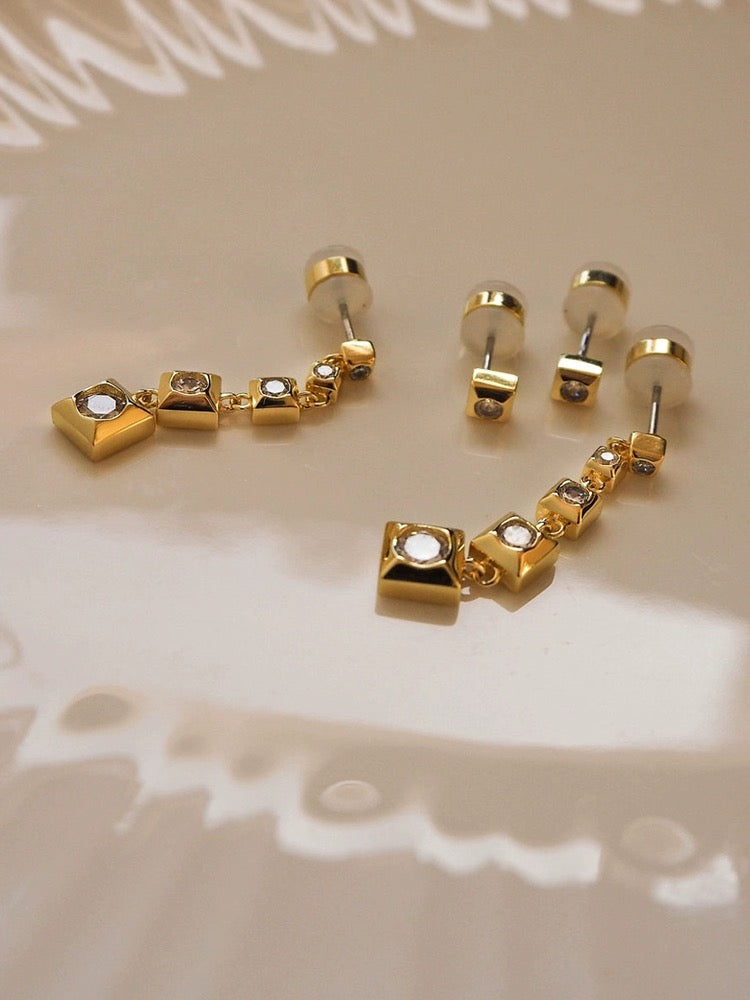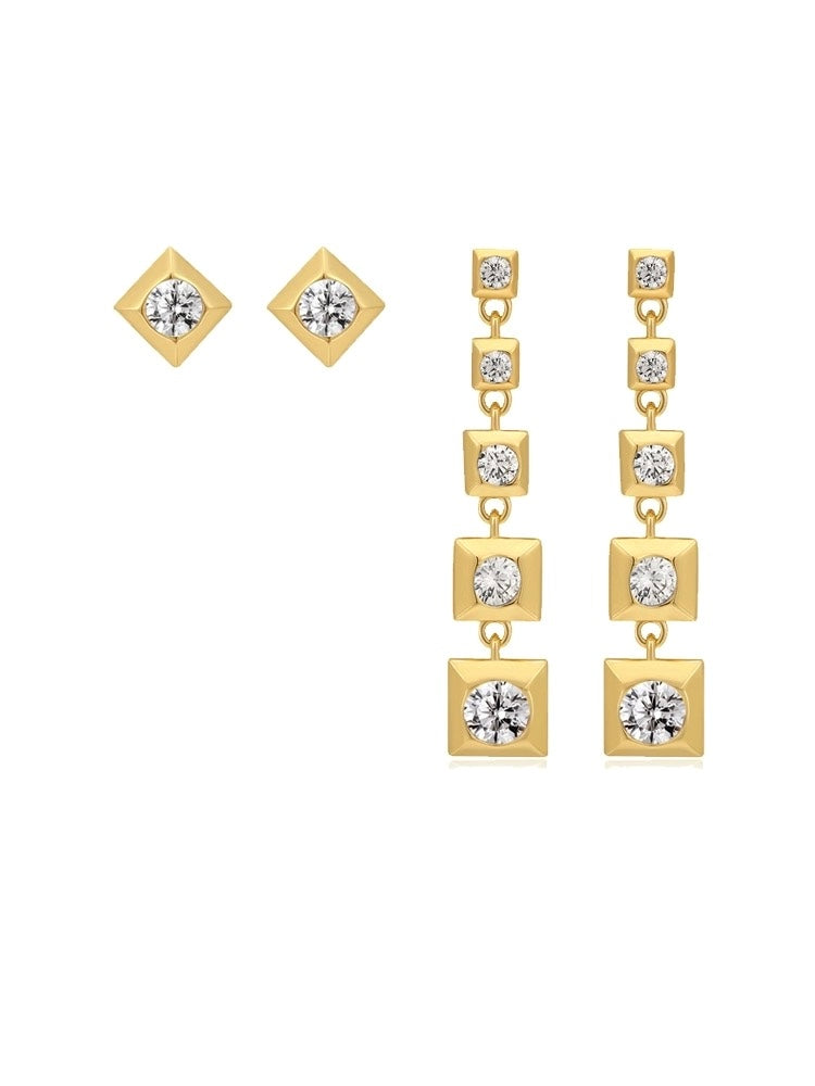 Our "Geometric Gold Earrings Set" is a masterful combination of structure and sparkle, bringing together the understated elegance of geometric shapes and the unrivaled brilliance of cascading diamonds. This set includes two styles: a pair of stud earrings that feature a single diamond within a sleek, geometric cut, and a pair of drop earrings that display a vertical array of diamonds, each set within square gold plate frames that descend in a graceful line.