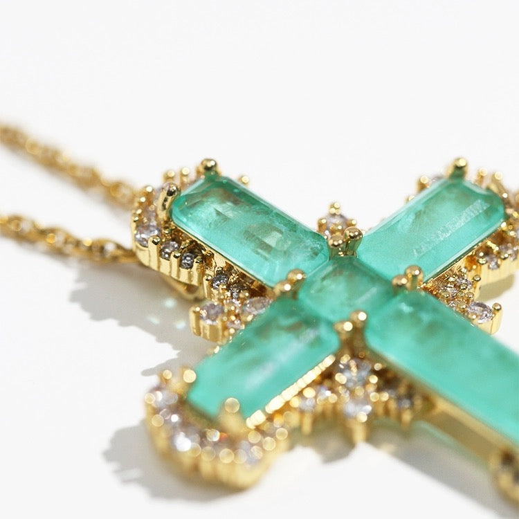 Our Regal Cross Pendant Diamond Necklace is a testament to divine craftsmanship, featuring rich emerald green gemstones meticulously set within a golden cross. This necklace, radiant with spiritual symbolism and elegance, is designed for the individual who carries a reverence for timeless motifs and the luminosity of precious stones. The cross pendant sits gracefully against your chest, each gemstone catching the light to reveal verdant depths reminiscent of ancient forests.