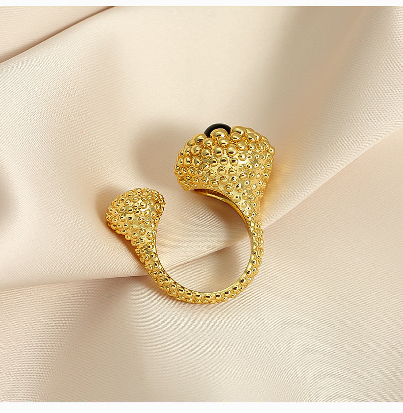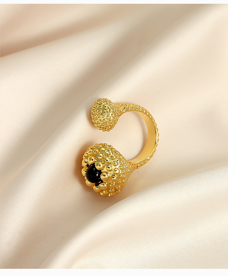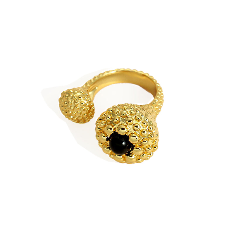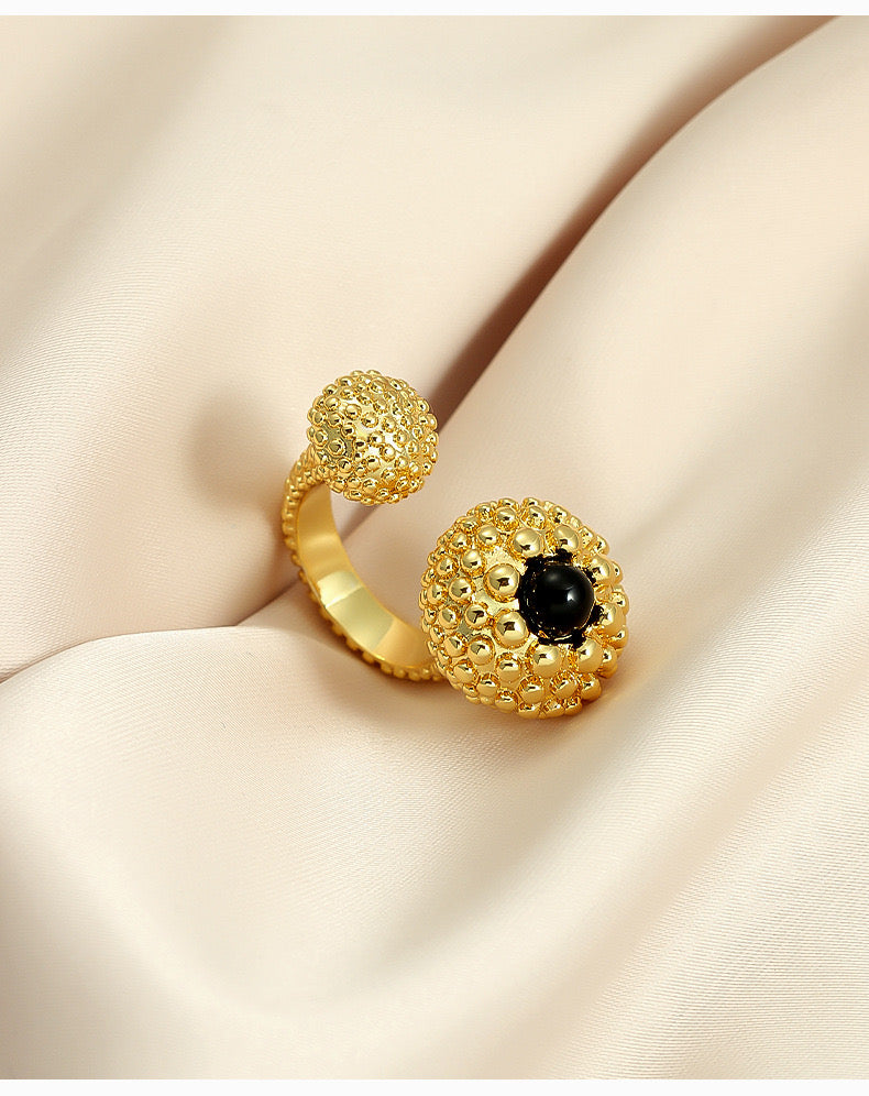Introducing our latest addition to the Vintage style Sculptural Gold Open Ring with Black Onyx Bead is a testament to modern jewelry design. It features a sleek open-band silhouette adorned with textured gold spheres and a captivating black onyx bead at its heart. This ring is a bold statement of style, crafted for those who dare to stand out.